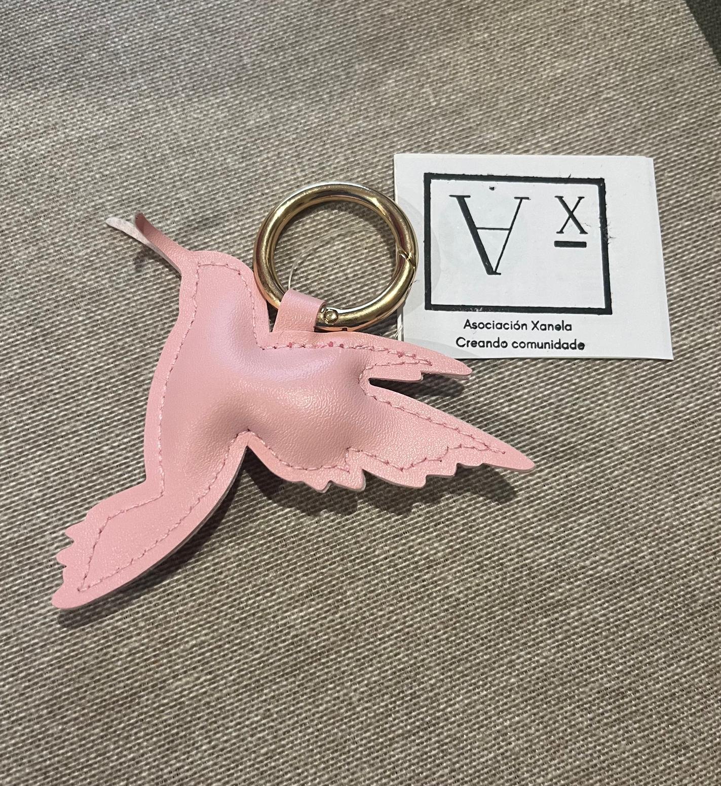Llavero de cuero con forma de pájaro de color rosa claro.