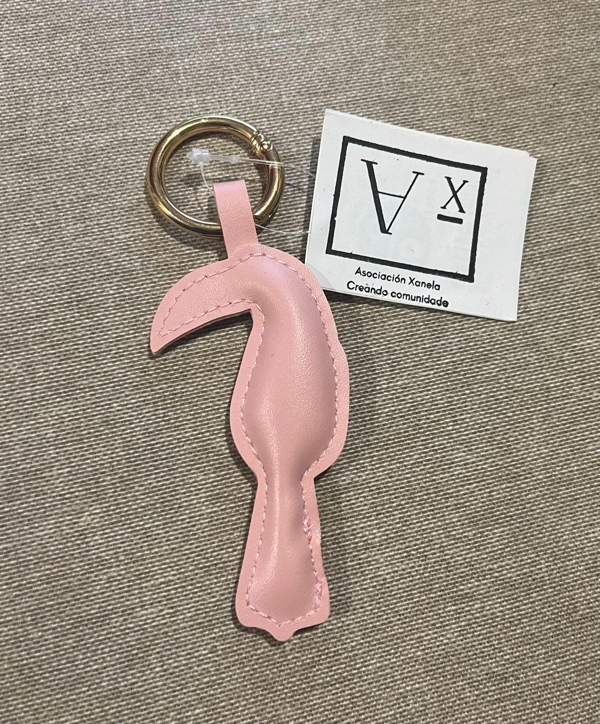 Llavero de cuero con forma de pájaro de color rosa claro.