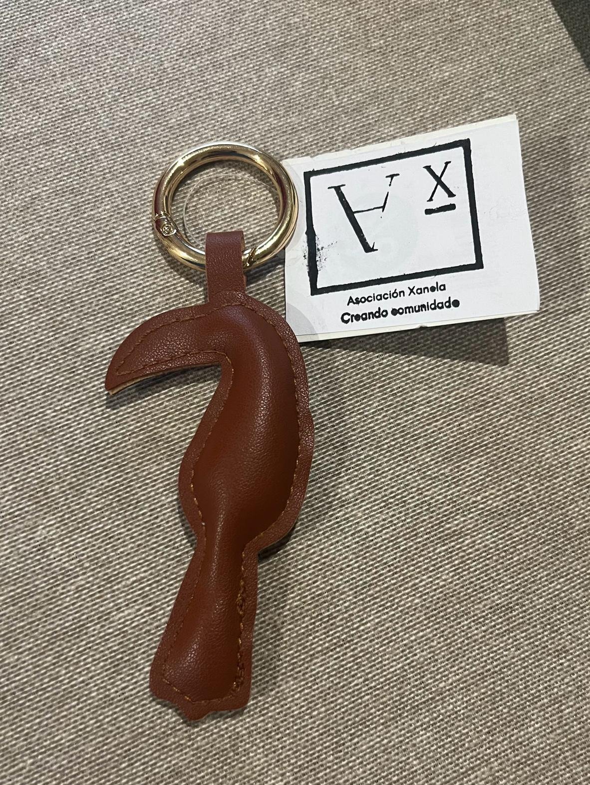 Llavero de cuero marrón con forma de pájaro de color marrón oscuro.