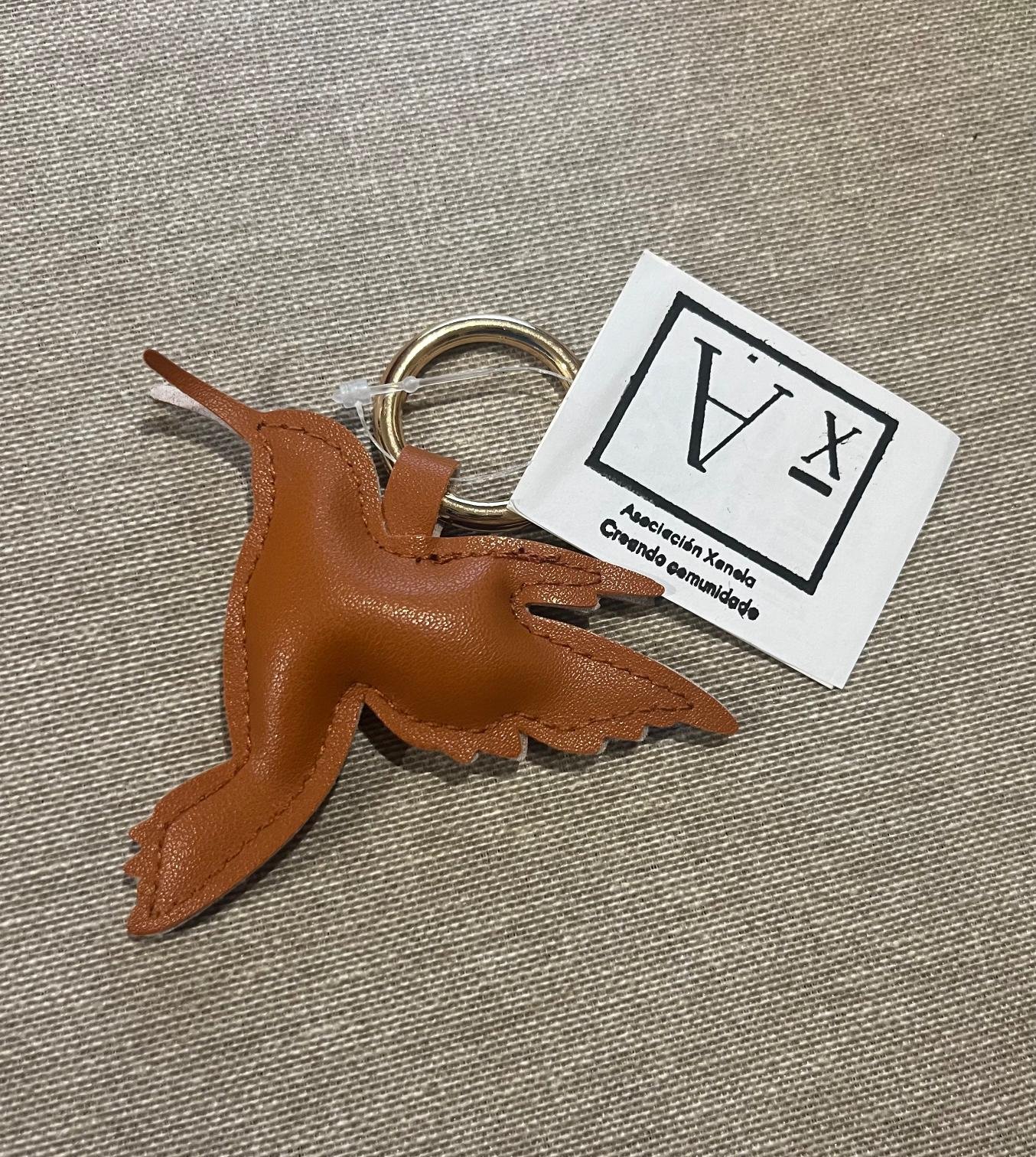 Llavero de cuero marrón con forma de pájaro de color marrón claro.