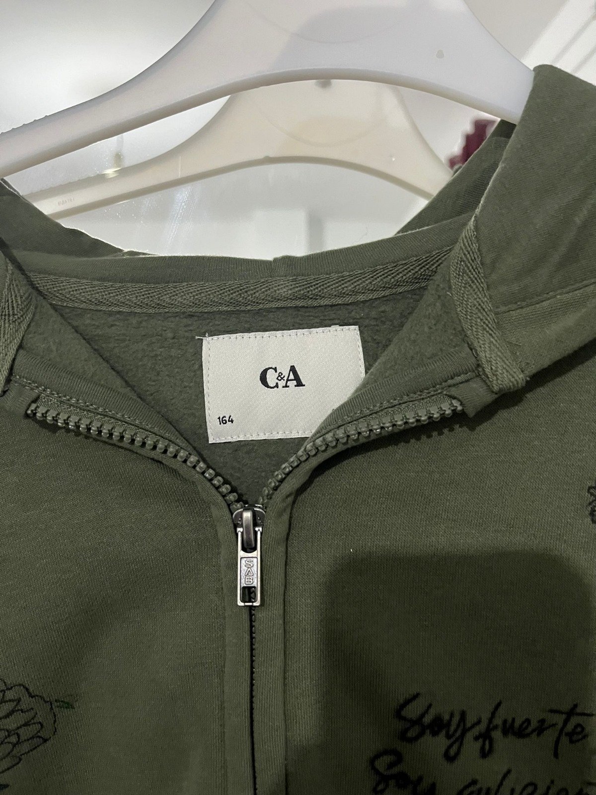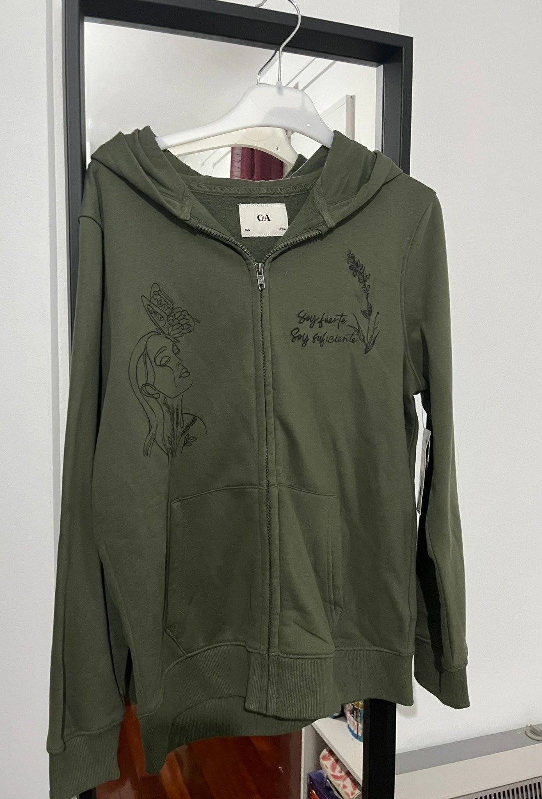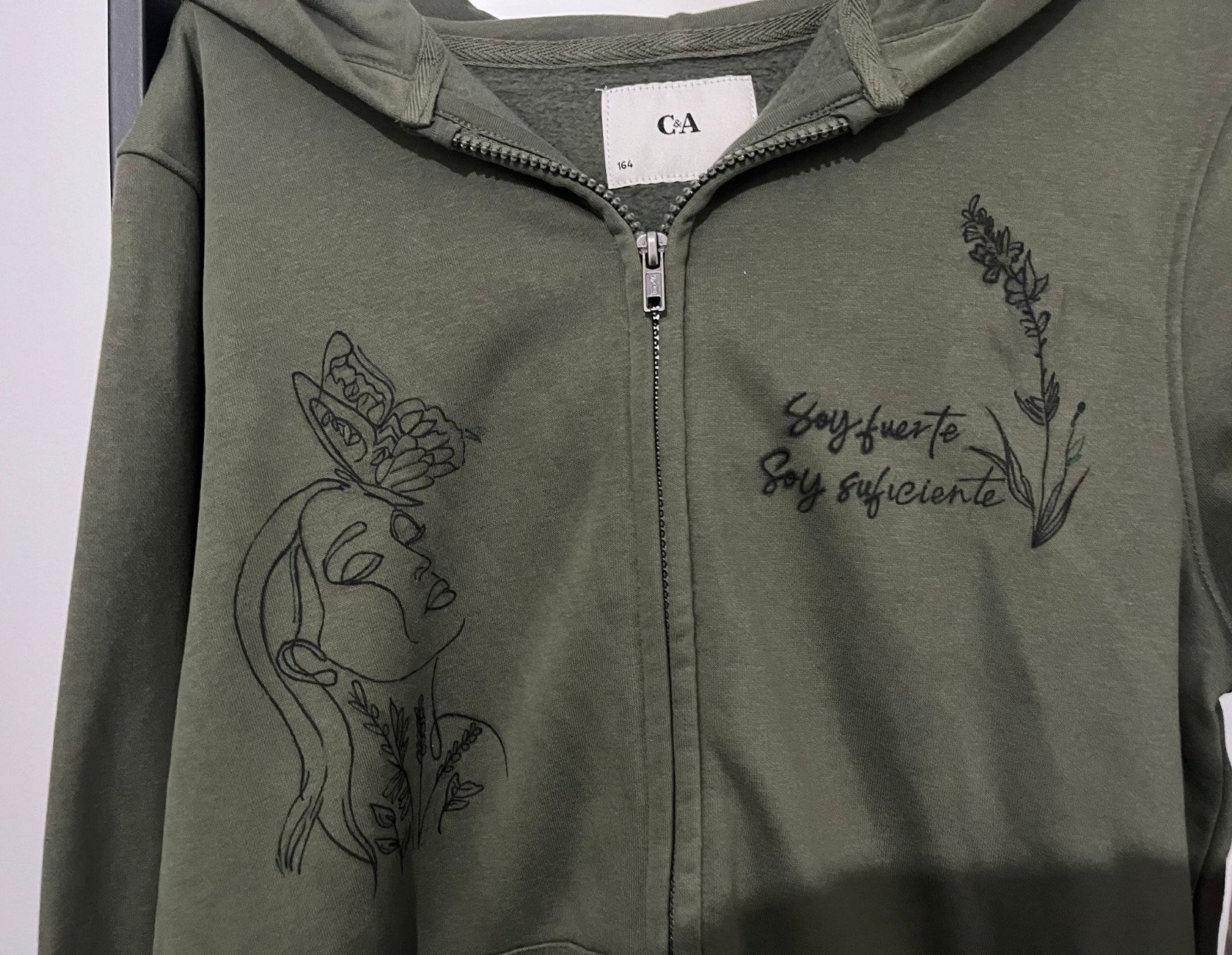 Sudadera de color verde kaki. La sudadera está serigrafiada con un rostro de mujer el mensaje “Soy fuerte, soy suficiente”.